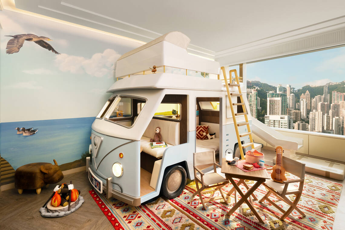 Enjoy your beachside getaway for a dose of vitamin sea! Hop onto your very own RV and park by the picturesque backdrop of the ocean to soak in the sun. Completed with a hanging hammock and playful toys, this is a room that would appeal to all ages.